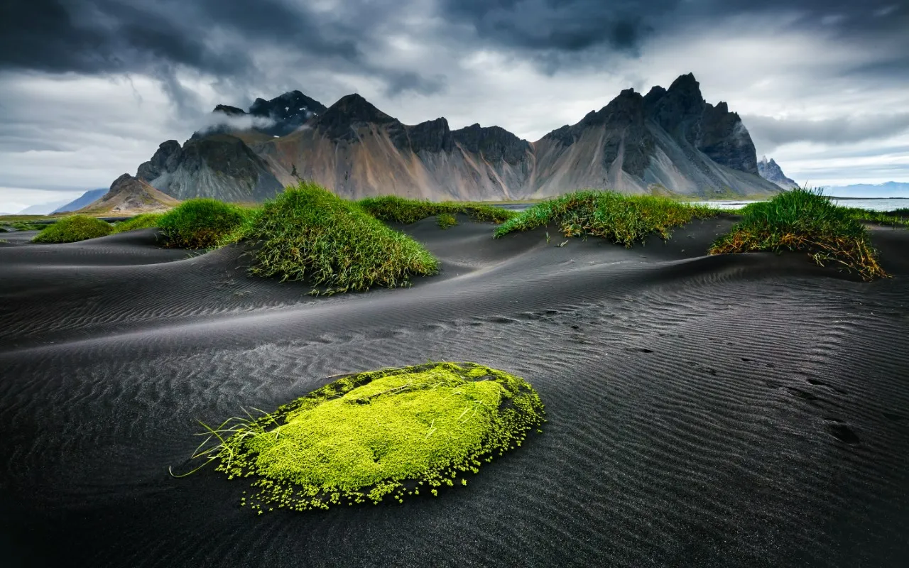 - Stokksnes & Vestrahorn (GPS: 64.2390, -14.9631): A cinematic black sand dune foreground with jagged peaks. Great for sunrise/sunset, or moody low-light scenes.